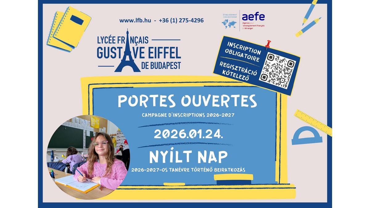Le Lycée Français Gustave Eiffel de Budapest accueille vos enfants dès la maternelle (à partir de 3 ans) et les accompagne jusqu’au baccalauréat, dans un environnement exigeant et chaleureux. Offrez-leur une scolarité en langue française, homologuée par le Ministère de l’Éducation nationale, au sein du réseau mondial de l’AEFE (Agence pour l’Enseignement Français à l’Etranger) présent dans 130 pays.