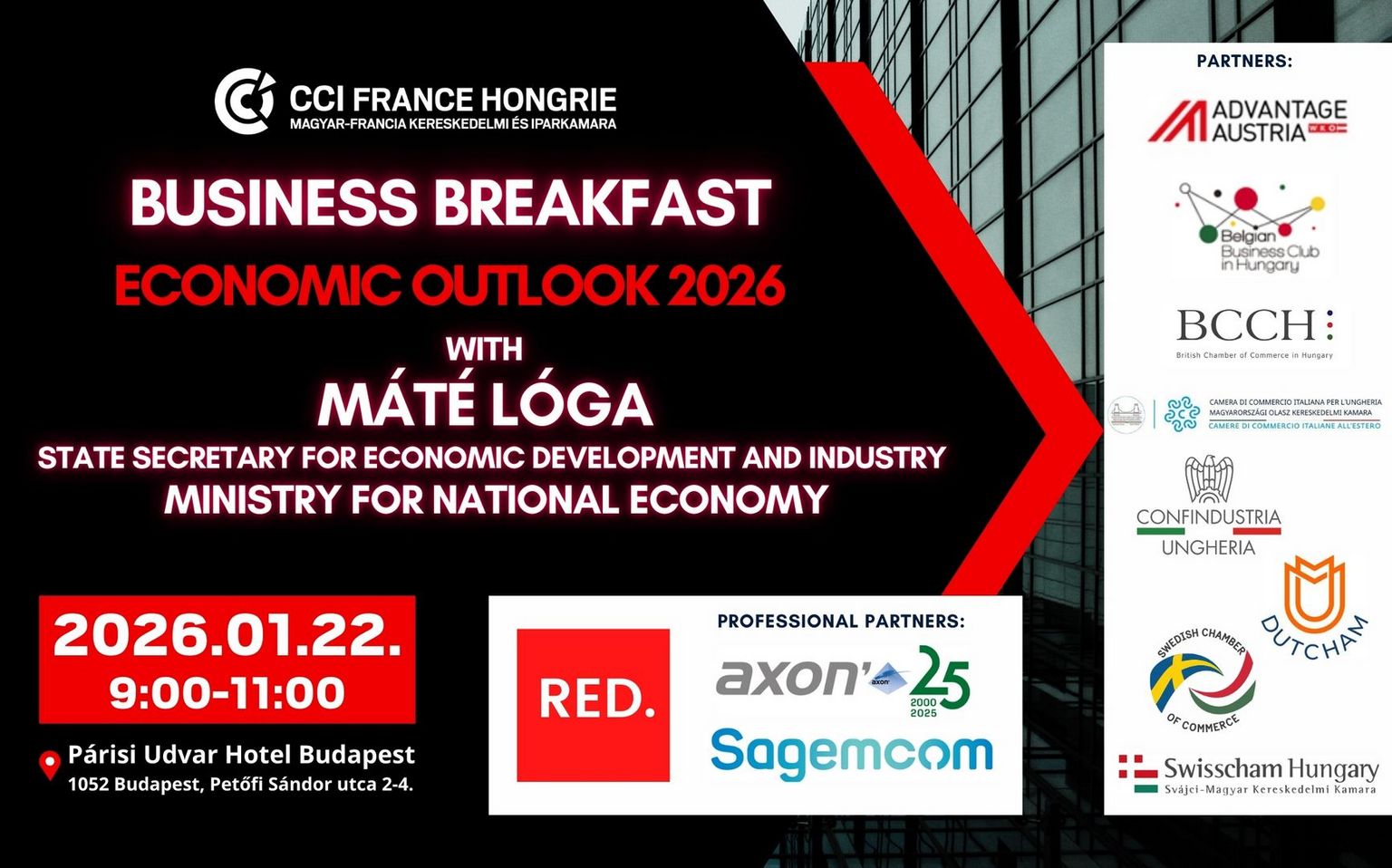 Date : le jeudi 22 janvier 2026 9h00-11h00 (Enregistrement et petit-déjeuner à partir de 8h30) Párisi Udvar Hotel Budapest (1052 Budapest, Petőfi Sándor utca 2-4.) Párisi Salon |