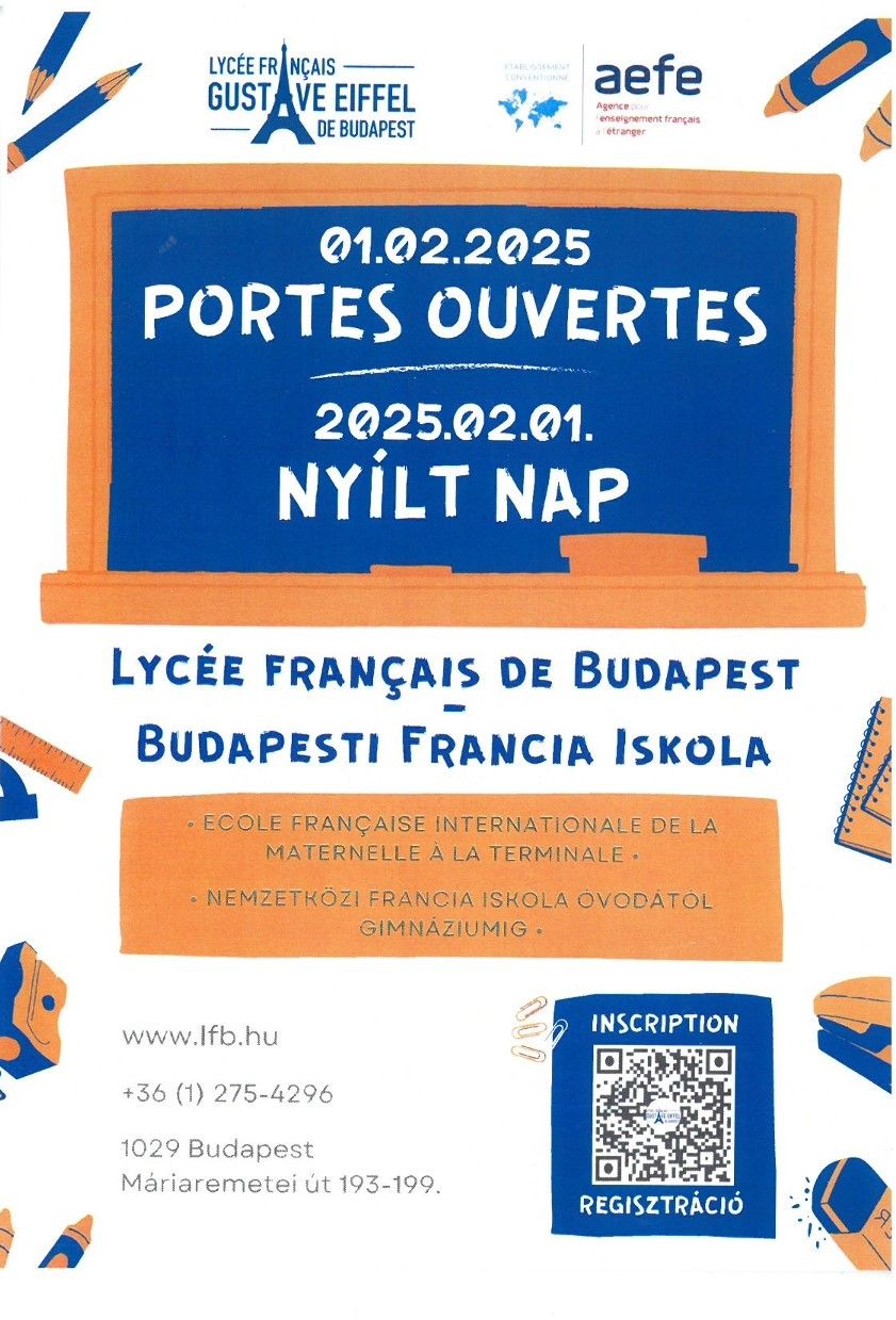 2025. február 1-jén, szombaton Nyílt Napot szervezünk. Három időpontot kínálunk az érdeklődők számára. Minden időpont egy 30 perces általános bemutatóval kezdődik az iskola vezetősége részéről, amelyet egy kb. 50 perces, kis csoportokban zajló vezetett iskolalátogatás követ. A csoportok francia, magyar és angol nyelven lesznek elérhetők.